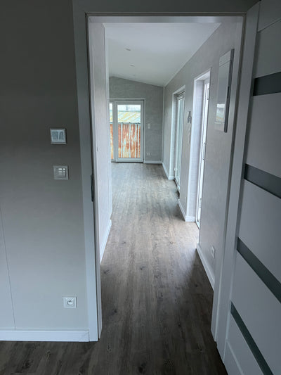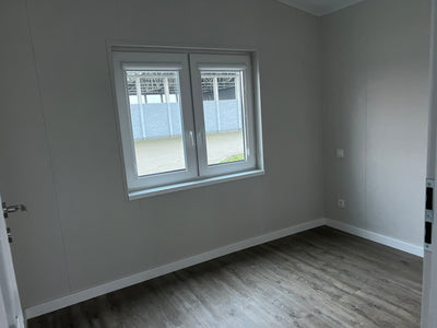 - Ściany wewnętrzne wykończone płytą z białą okleiną i listwami przypodłogowymi PVC