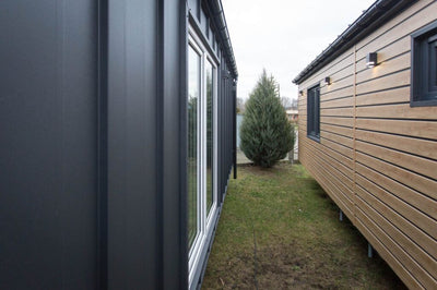 - Wykończenie elewacji panelami PCV lub deską imitującą drewno.