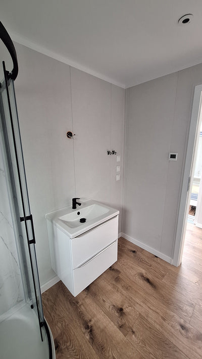 - Ściany wewnętrzne wykończone płytą z białą okleiną i listwami przypodłogowymi PVC